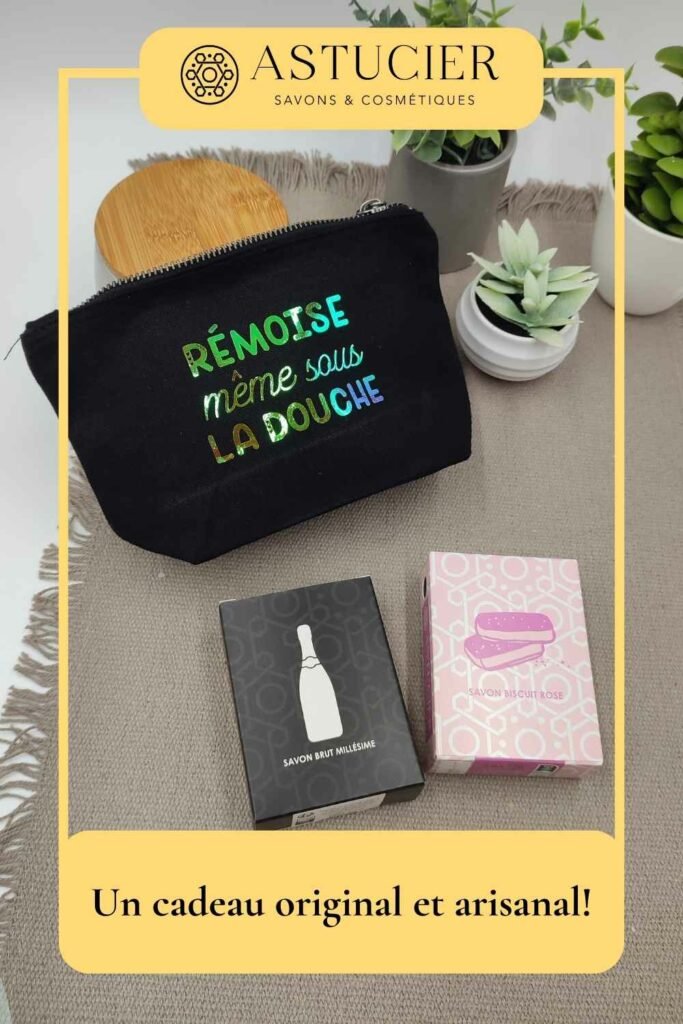 Les savons sont fabriqués en petites séries, avec des ingrédients de qualité issus du terroir champenois. La trousse en coton noir est réutilisable et élégante, idéale pour transporter tes cosmétiques préférés.