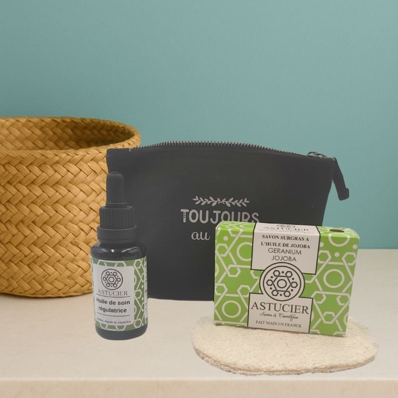 Ce coffret, je l’ai construit pour casser ce cercle : nettoyer proprement avec un savon à froid adapté, puis réguler sans agresser avec une huile pensée pour l’équilibre.