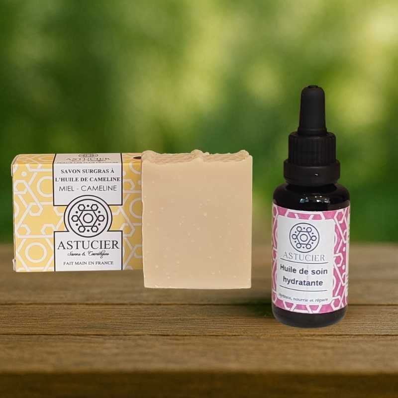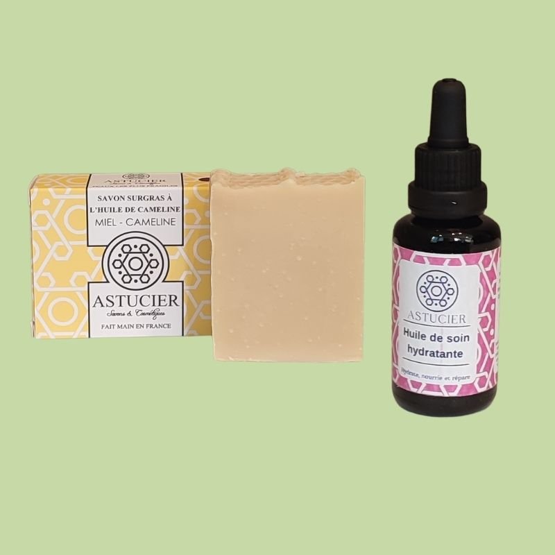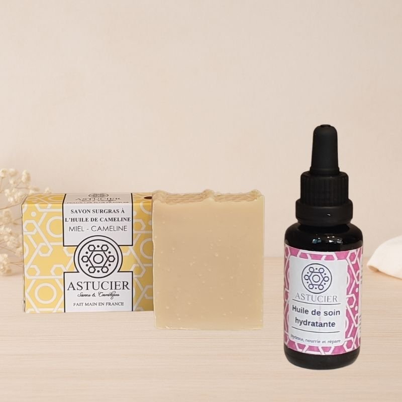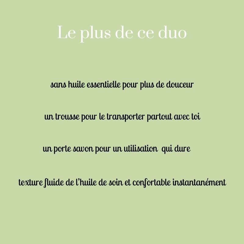 Poids savon / contenance huile : savon de 100g et huile de soin de 30ml